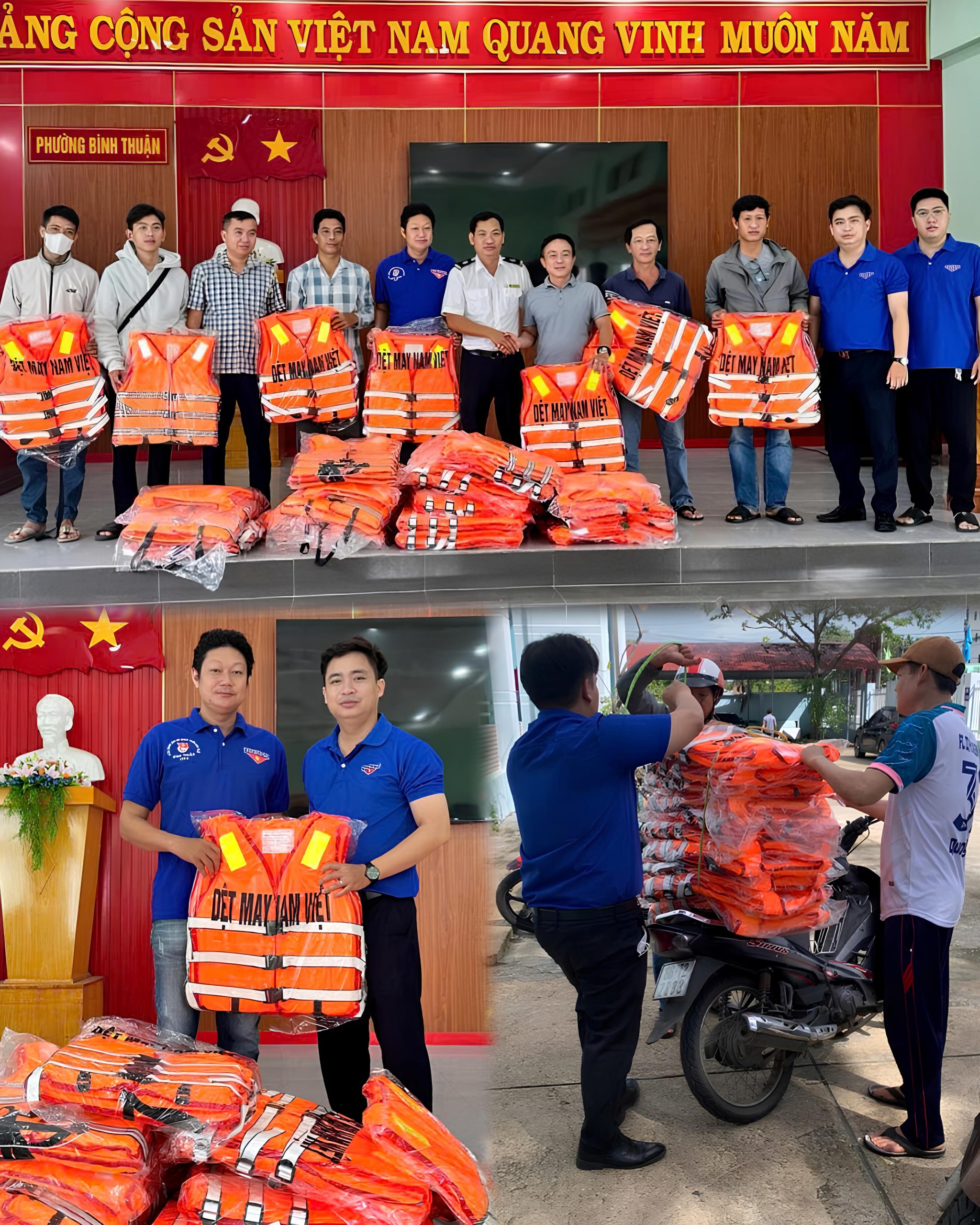 Tại vùng lũ, màu áo xanh của các đoàn viên Cảng vụ Hàng hải Bình Thuận đã phối hợp nhịp nhàng cùng Đoàn thanh niên phường Bình Thuận, trực tiếp trao tặng áo phao cứu sinh để gửi đến từng hộ gia đình bị cô lập.